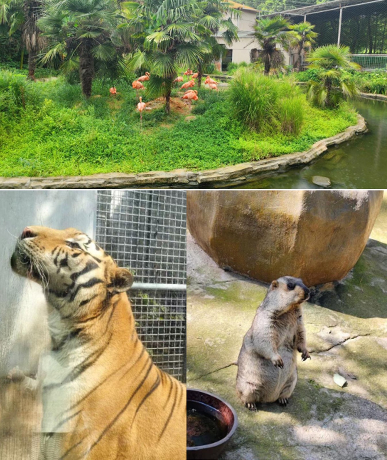 在老虎園區(qū)里,威風凜凜的白虎和東北虎隔著籠子互相打量,時而發(fā)出低沉的吼聲交流,而另一邊的兩頭東北虎則親密地緊挨在一起打盹,斑駁的樹影灑在它們金黃的皮毛上。不遠處的犀牛區(qū),兩只體型龐大的白犀牛正在上演領地之爭,它們用粗壯的角互相頂撞,揚起陣陣塵土,發(fā)出沉重的鼻息聲;非洲大羚羊區(qū)最是熱鬧,高大的羚羊們溫順地低下頭,伸著脖子吃著小朋友親手投喂的食物,長長的睫毛在陽光下忽閃忽閃。樹冠間,靈巧的長臂猿扒著樹干蕩著秋千,偶爾還會停下來好奇地觀察下方拍照的游客。園區(qū)主干道上,飼養(yǎng)員牽著一匹可愛的袖珍小馬漫步,珍珠馬的脖子上系著的鈴鐺隨著步伐發(fā)出清脆的聲響。整個園區(qū)洋溢著人與動物和諧相處的氛圍。